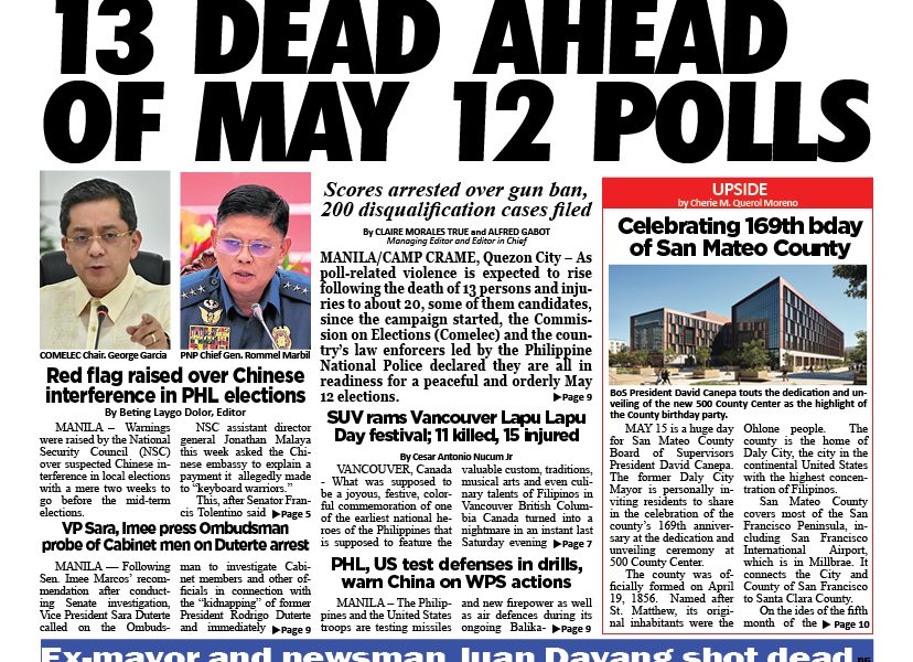 13 DEAD AHEAD OF MAY 12 PHL ELECTIONS; Many injured, scores held over gun ban, over 200 disqualification cases filed