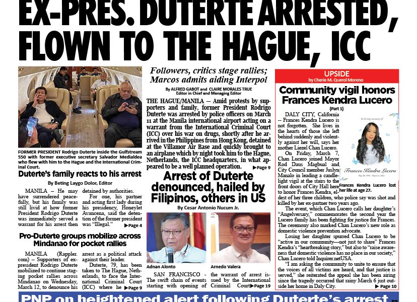 EX-PRES. DUTERTE ARRESTED, FLOWN TO THE HAGUE, ICC; Followers, critics stage rallies, Marcos admits aiding Interpol